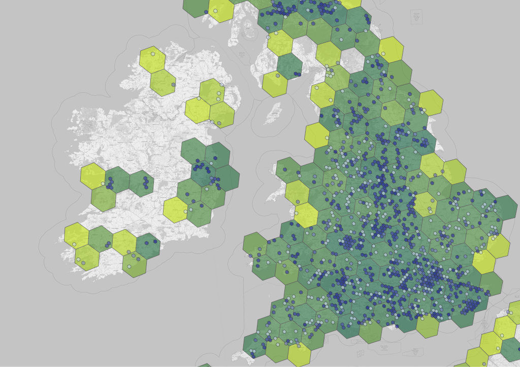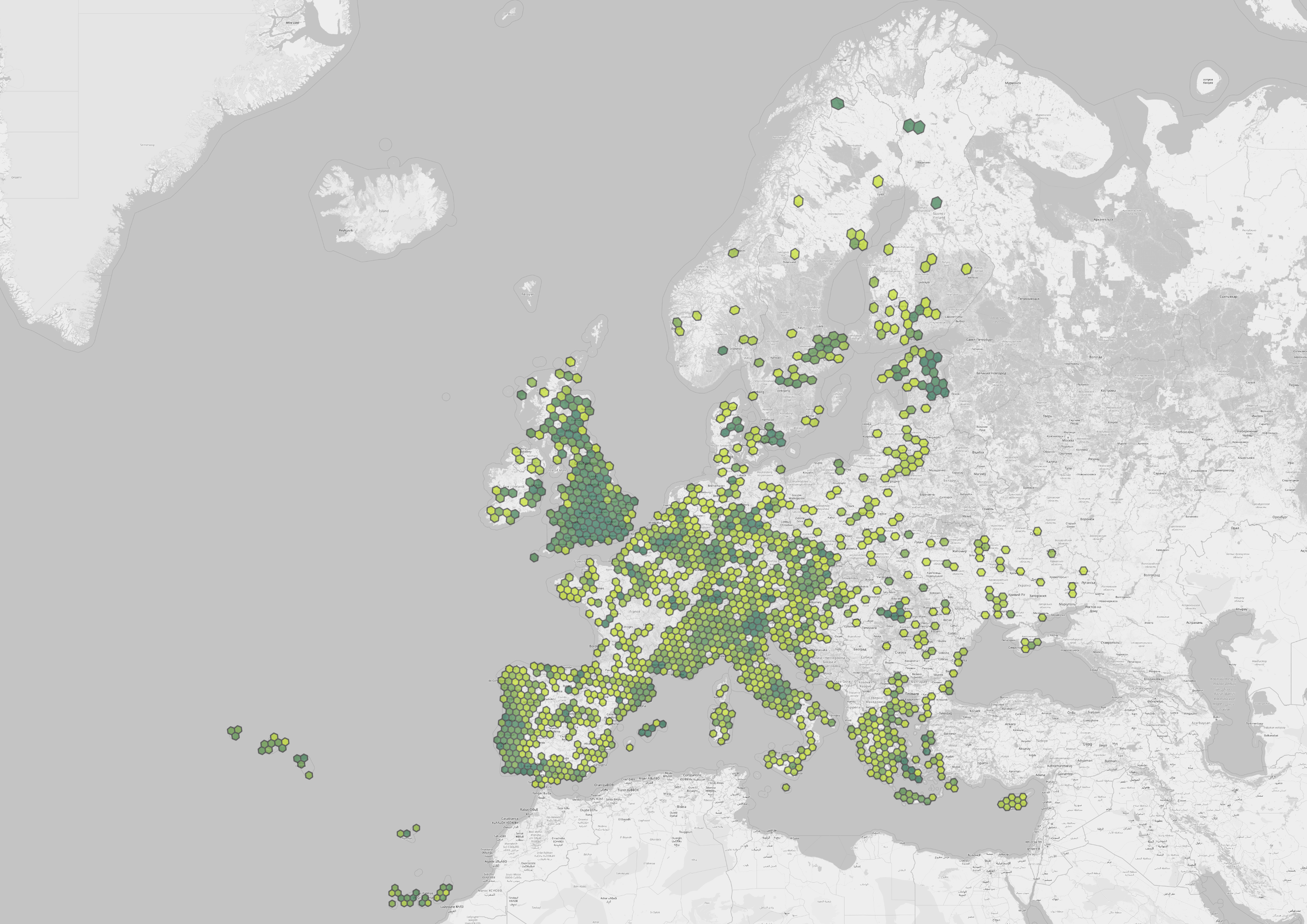 After creating the geopackages, QGIS v3.34.4-Prizren was used to visualize the h3 geopackages and put them on a map of the world provided by OpenStreetMap. Figures 1., and 2. highlight geographic areas with higher (darker), lower (lighter), or no data coverage. The larger yellow/green hexagons are at h3 resolution level 4, whereas the smaller blue hexagons are a more granular scale, at h3 resolution level 6. All with © OpenStreetMap contributors and © EuroGeographics for the administrative boundaries .